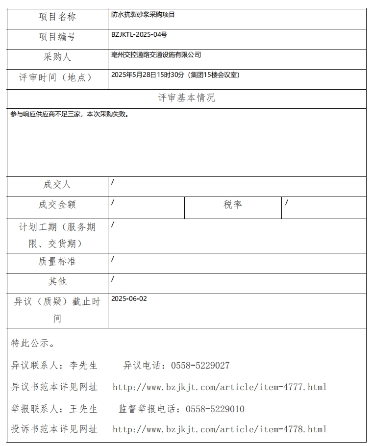 防水抗裂砂漿采購項(xiàng)目成交結(jié)果公示