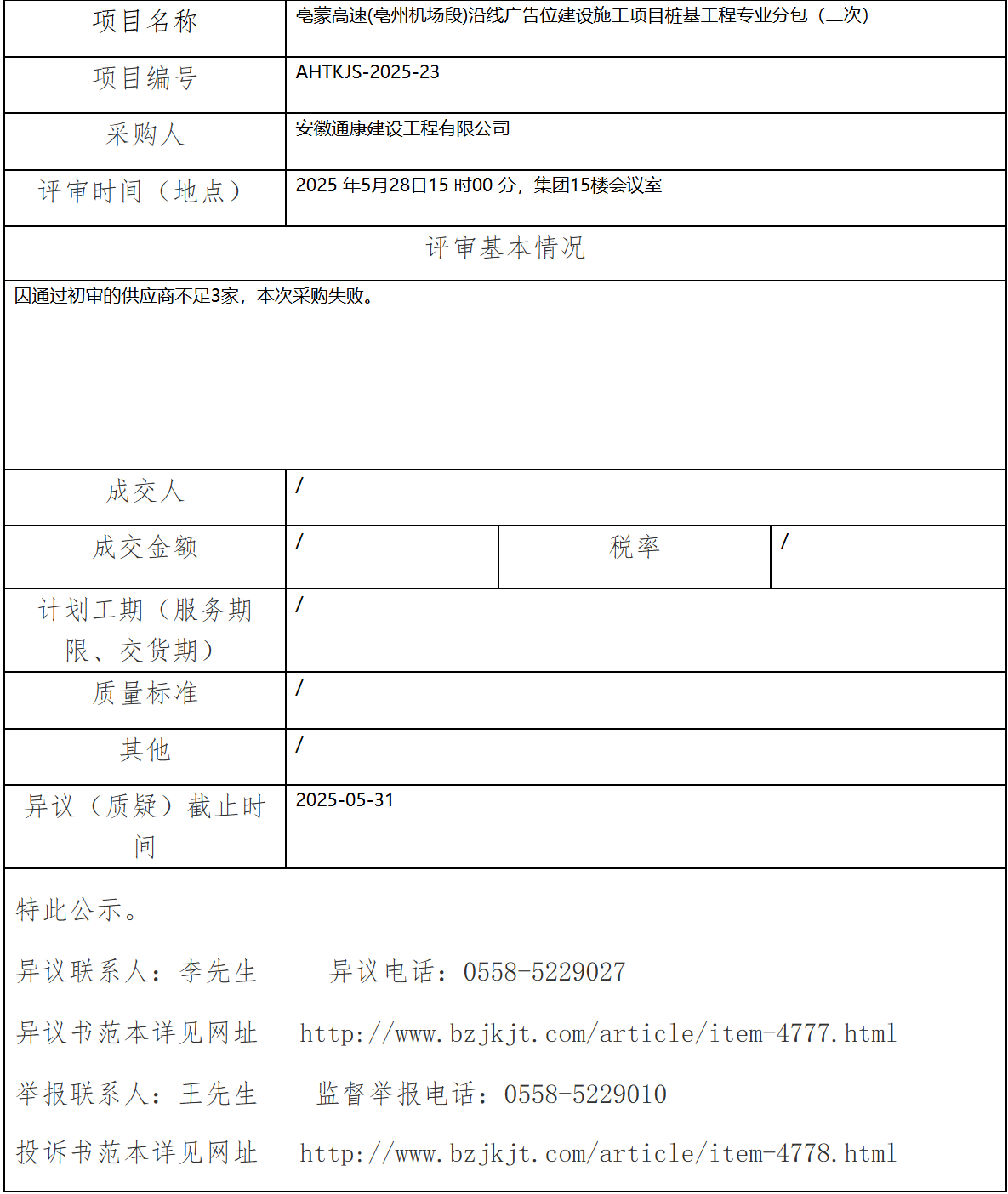 亳蒙高速(亳州機(jī)場(chǎng)段)沿線廣告位建設(shè)施工項(xiàng)目樁基工程專業(yè)分包(二次)成交結(jié)果公示