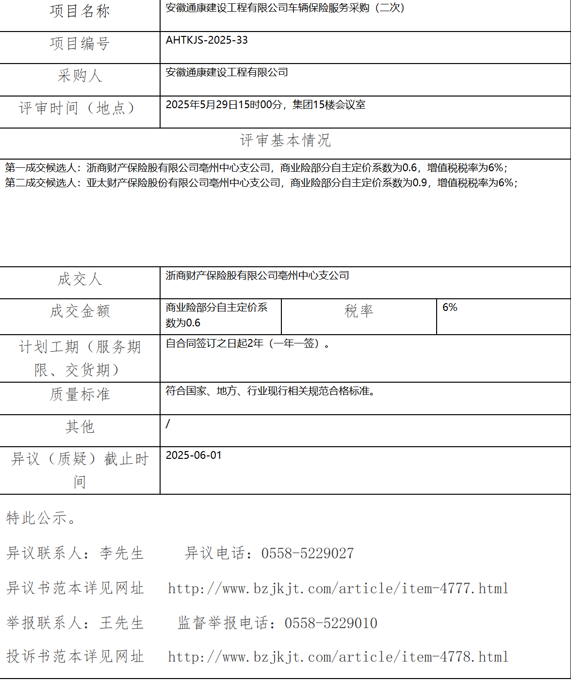 安徽通康建設(shè)工程有限公司車輛保險(xiǎn)服務(wù)采購(二次)成交結(jié)果公示