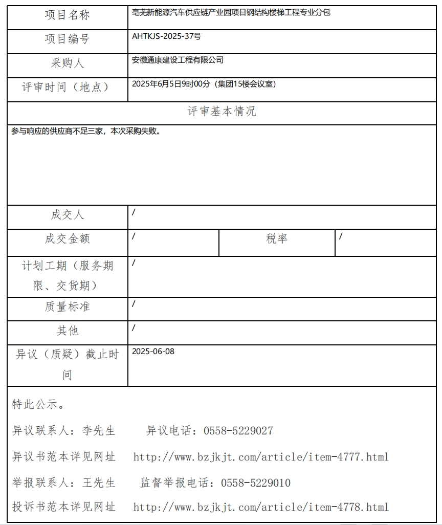 亳蕪新能源汽車供應(yīng)鏈產(chǎn)業(yè)園項(xiàng)目鋼結(jié)構(gòu)樓梯工程專業(yè)分包成交結(jié)果公示