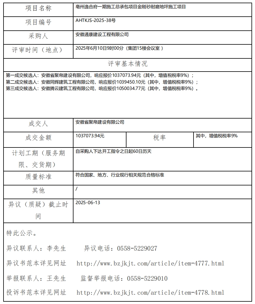 亳州逸合府一期施工總承包項目金剛砂耐磨地坪施工項目成交結果公示