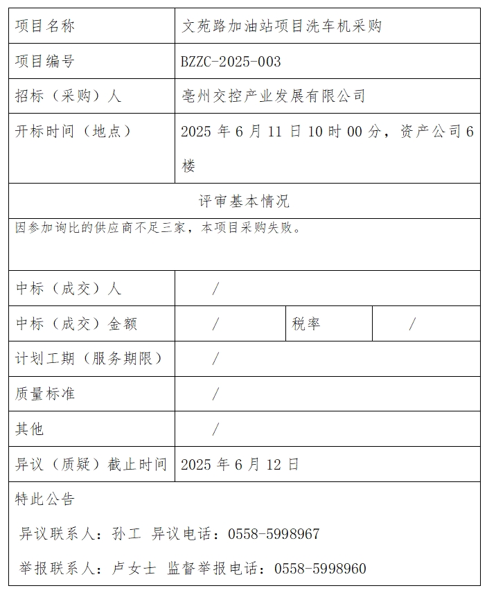 文苑路加油站項(xiàng)目洗車(chē)機(jī)采購(gòu)成交結(jié)果