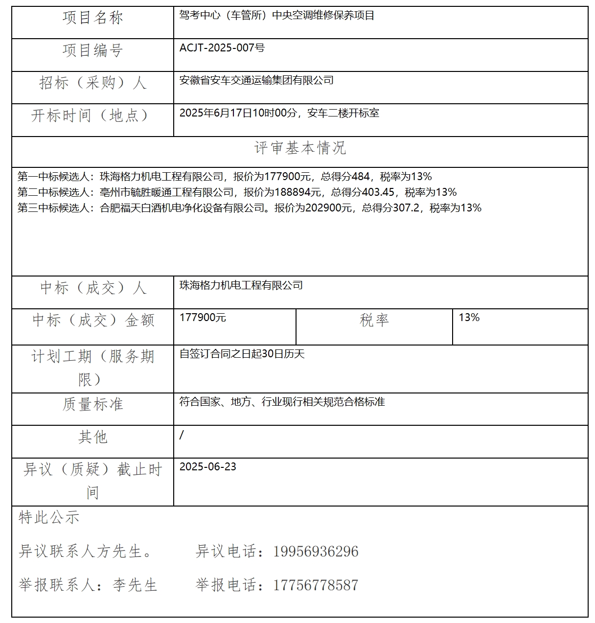 駕考中心(車管所)中央空調(diào)維修保養(yǎng)項目中標(biāo)(成交)結(jié)果公示