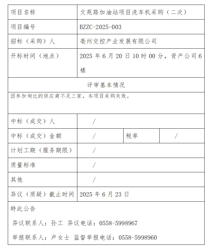 文苑路加油站項目洗車機采購(二次)成交結(jié)果公告