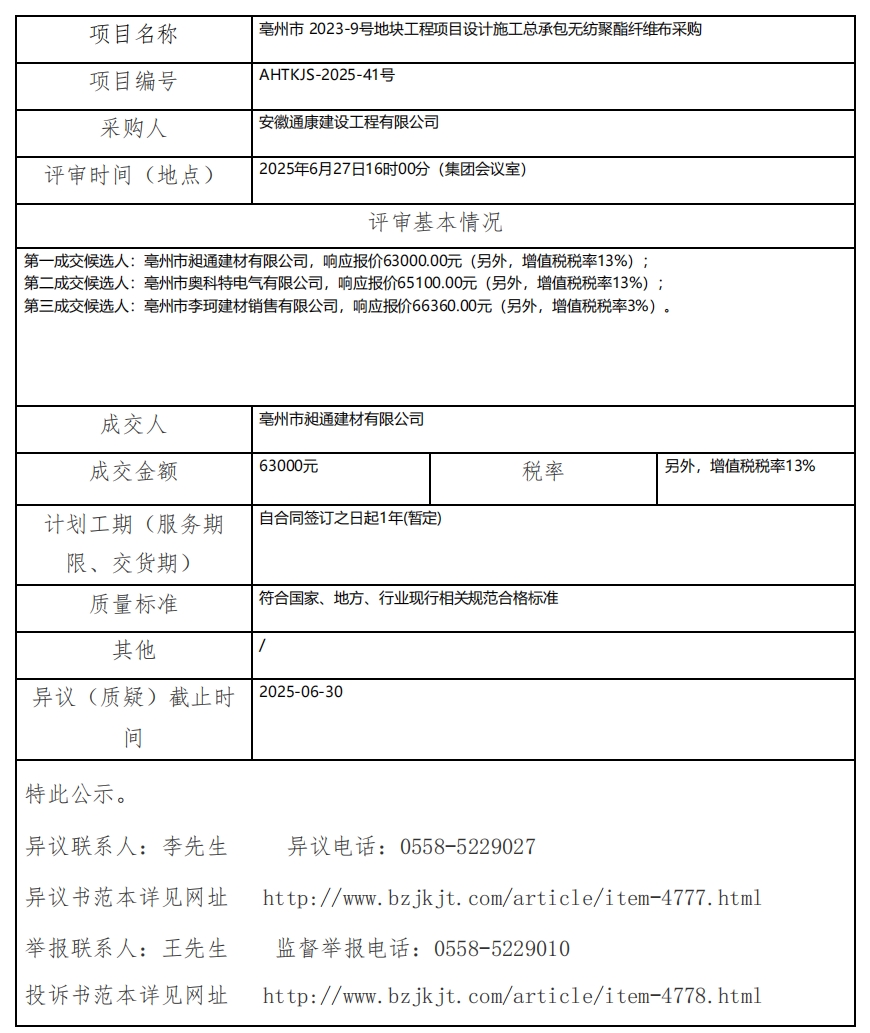 亳州市 2023-9號(hào)地塊工程項(xiàng)目設(shè)計(jì)施工總承包無(wú)紡聚酯纖維布采購(gòu)成交結(jié)果公示