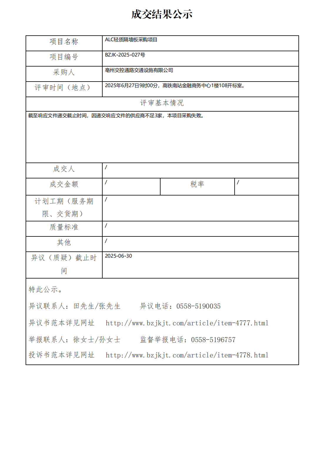 ALC輕質(zhì)隔墻板采購(gòu)項(xiàng)目成交結(jié)果公示