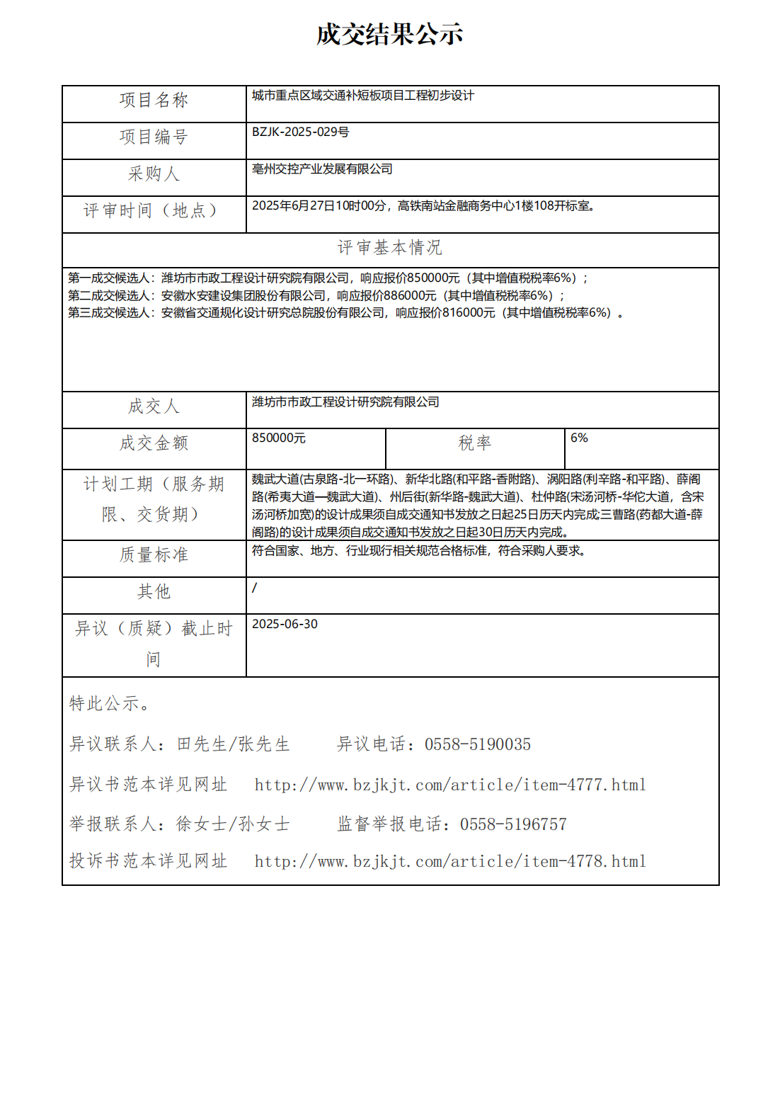 城市重點(diǎn)區(qū)域交通補(bǔ)短板項(xiàng)目工程初步設(shè)計(jì)成交結(jié)果公示