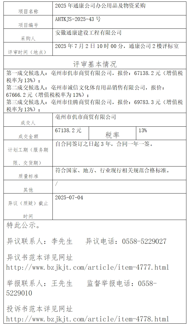 2025年通康公司辦公用品及物資采購(gòu)成交結(jié)果公示