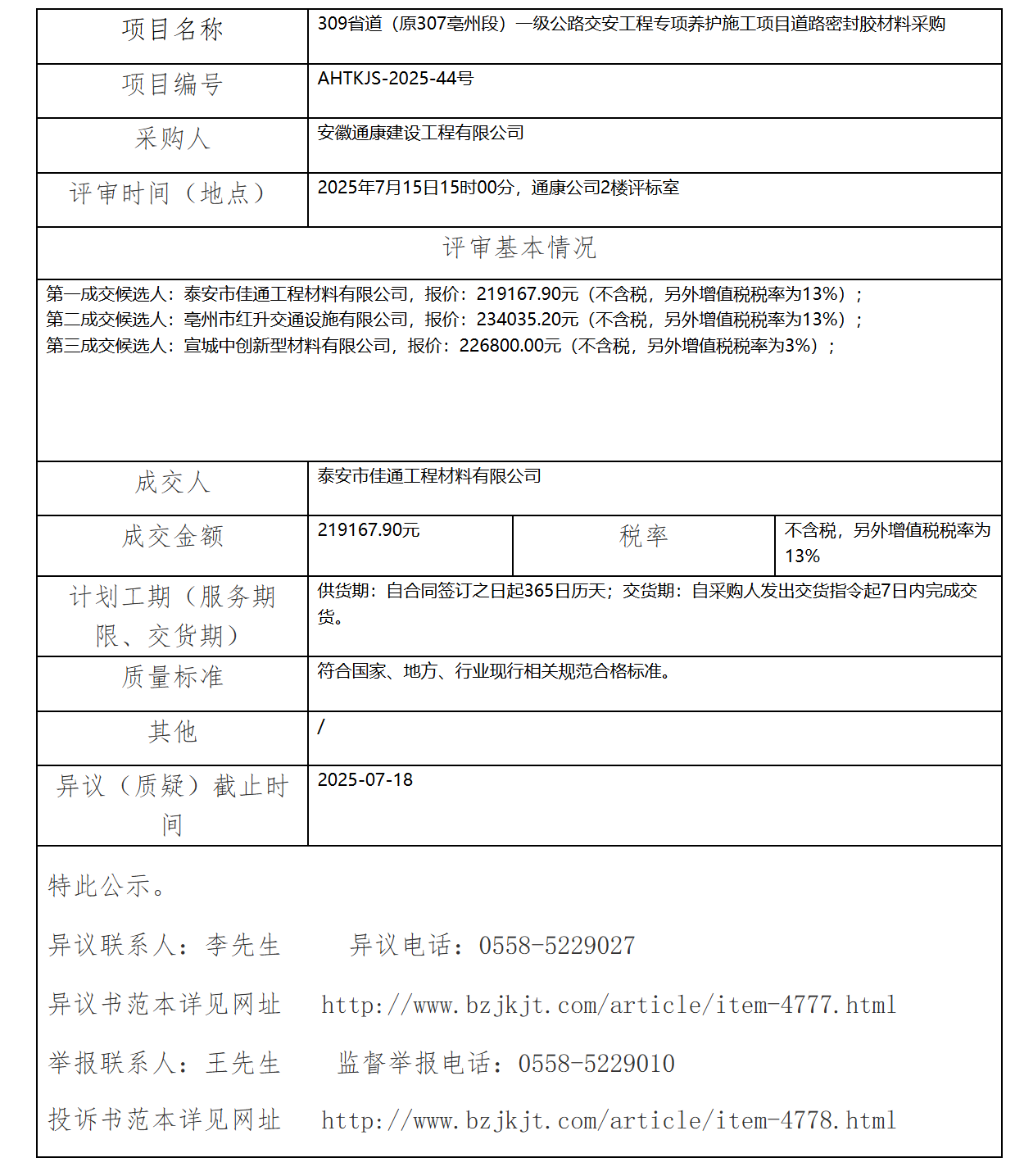 309省道(原307亳州段)一級(jí)公路交安工程專項(xiàng)養(yǎng)護(hù)施工項(xiàng)目道路密封膠材料采購(gòu)成交結(jié)果公示