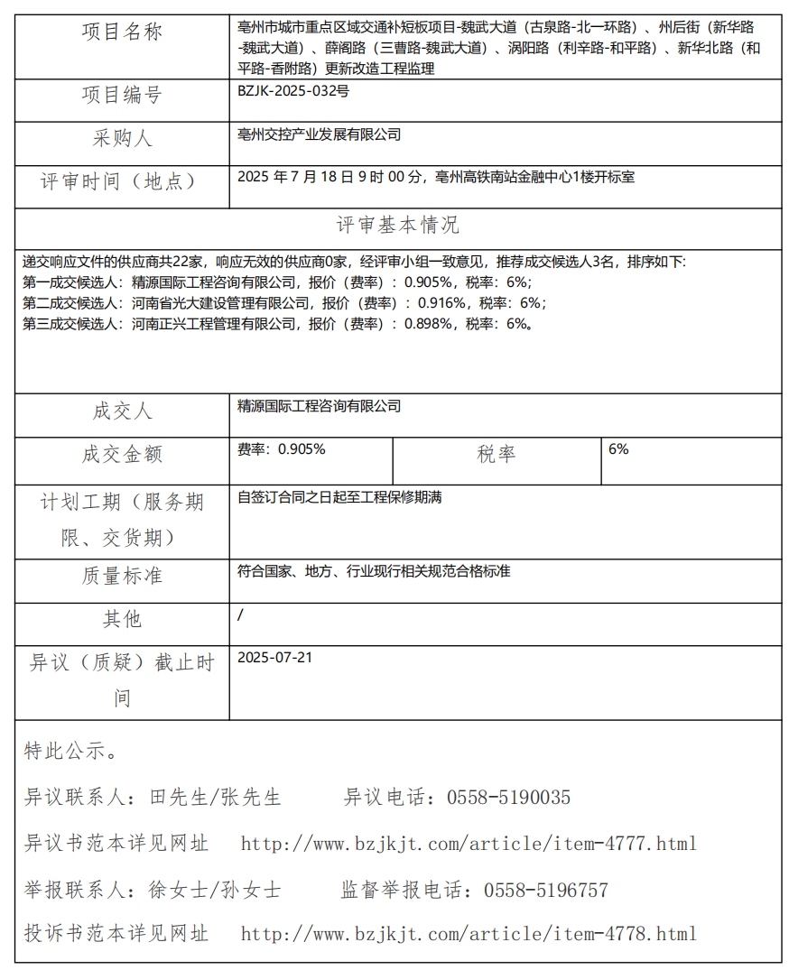 亳州市城市重點(diǎn)區(qū)域交通補(bǔ)短板項(xiàng)目-魏武大道(古泉路-北一環(huán)路)、州后街(新華路-魏武大道)、薛閣路(三曹路-魏武大道)、渦陽路(利辛路-和平路)、新華北路(和平路-香附路)更新改造工程監(jiān)理成交結(jié)果公示