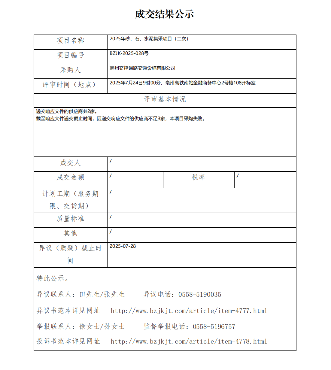 2025年砂、石、水泥集采項目(二次)成交結(jié)果公示