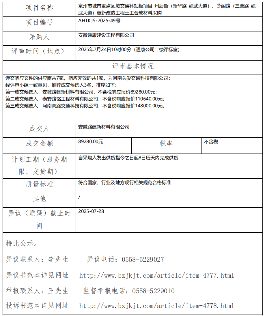 亳州市城市重點(diǎn)區(qū)域交通補(bǔ)短板項(xiàng)目-州后街(新華路-魏武大道)、薛閣路(三曹路-魏 武大道)更新改造工程土工合成材料采購(gòu)成交結(jié)果公示