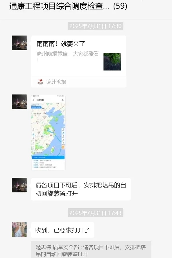 提前部署防汛工作,全面排查施工現(xiàn)場排水系統(tǒng)、臨時設施穩(wěn)固性及應急物資儲備情況,對低洼易澇區(qū)域針對性落實防洪排澇措施,嚴格執(zhí)行24小時領導帶班和專人值班制度,密切跟蹤氣象預警和雨情水情信息,確保信息暢通、響應迅速、防范有效。