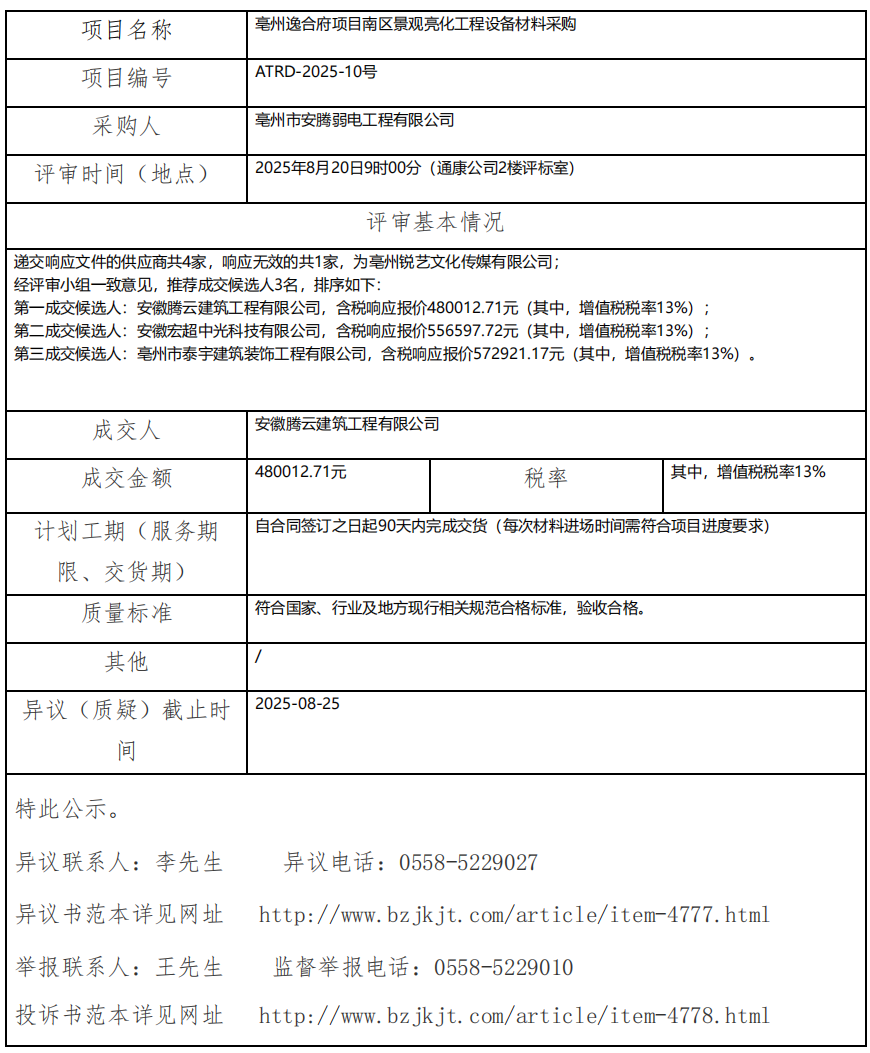 亳州逸合府項(xiàng)目南區(qū)景觀亮化工程設(shè)備材料采購成交結(jié)果公示