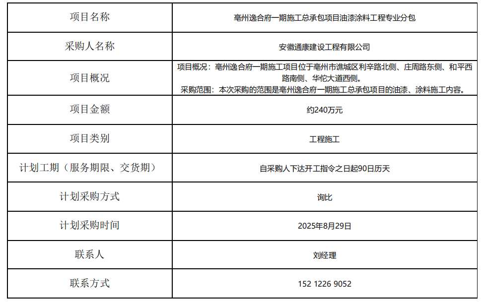 亳州逸合府一期施工總承包項目油漆涂料工程專業(yè)分包采購計劃