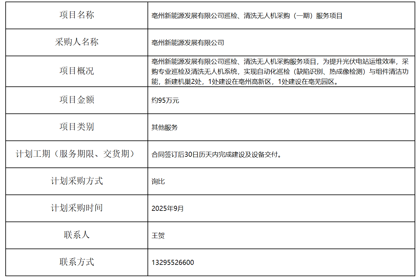 亳州新能源發(fā)展有限公司巡檢、清洗無人機采購(一期)服務(wù)項目招標(biāo)計劃
