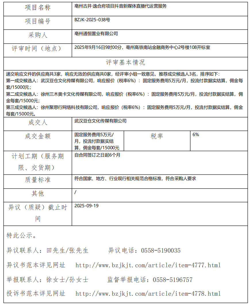 亳州古井·逸合府項目抖音新媒體直播代運營服務成交結果公示
