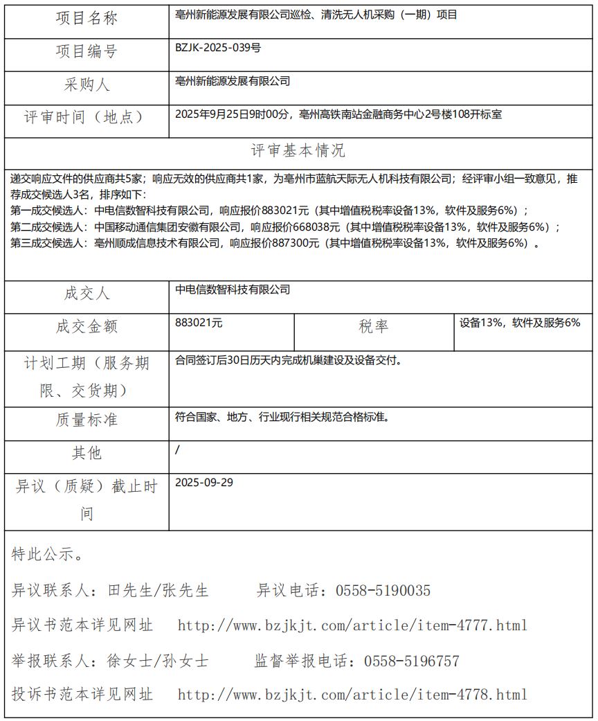 亳州新能源發(fā)展有限公司巡檢、清洗無人機(jī)采購(gòu)(一期)項(xiàng)目成交結(jié)果公示