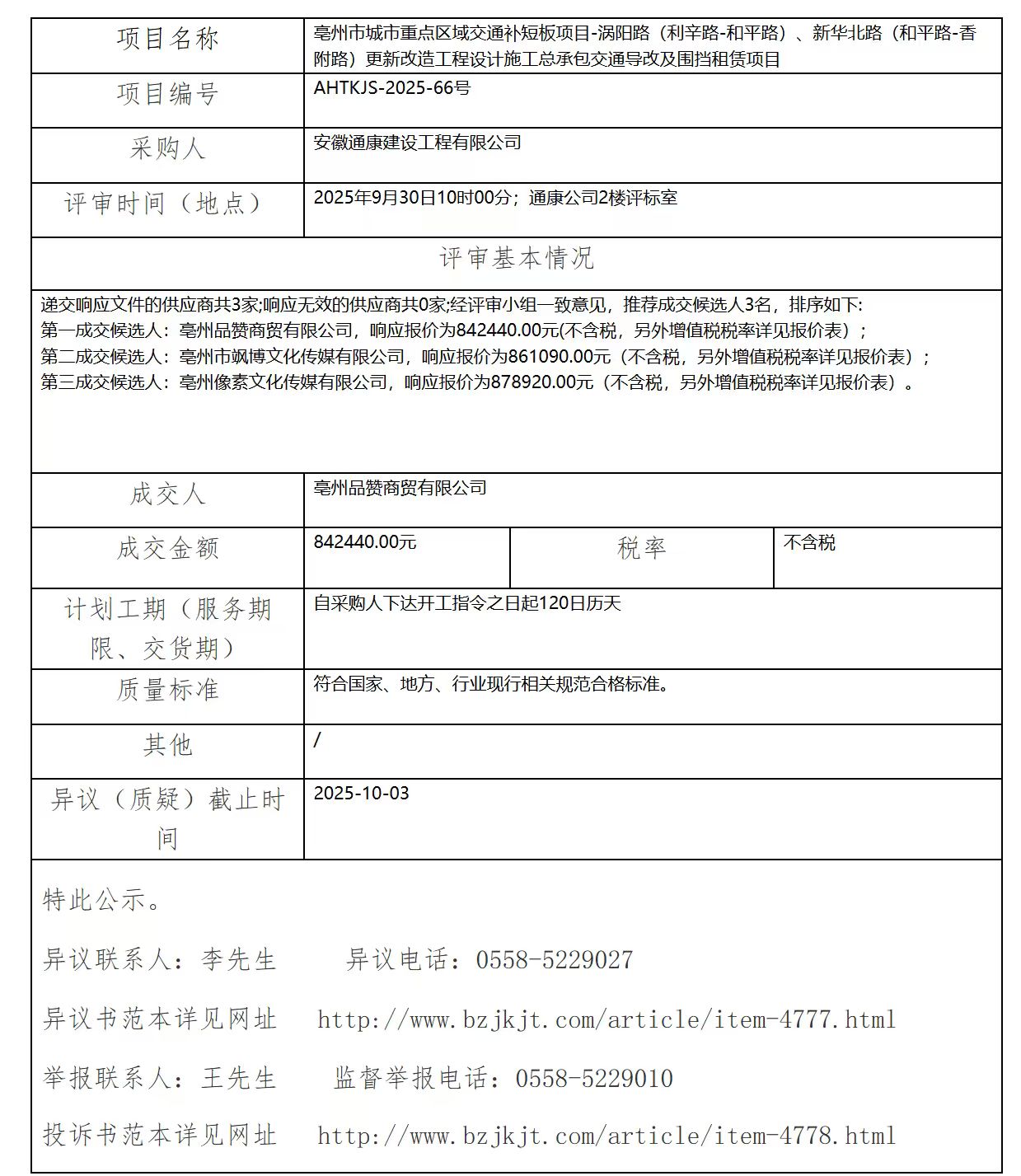 亳州市城市重點區(qū)域交通補短板項目-渦陽路(利辛路-和平路)、新華北路(和平路-香附路)更新改造工程設計施工總承包交通導改及圍擋租賃項目成交結(jié)果公示