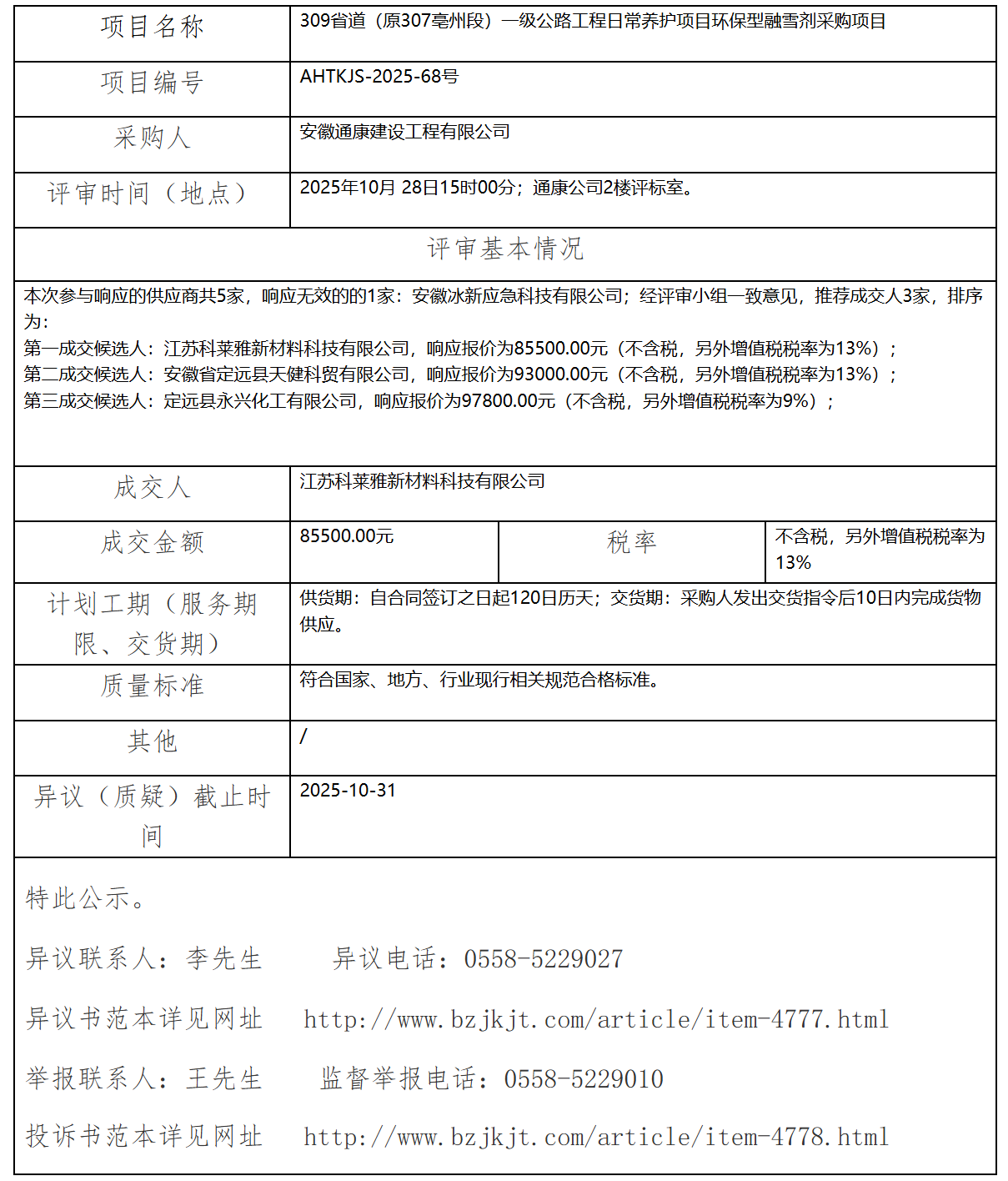 309省道(原307亳州段)一級(jí)公路工程日常養(yǎng)護(hù)項(xiàng)目環(huán)保型融雪劑采購(gòu)項(xiàng)目成交結(jié)果公示