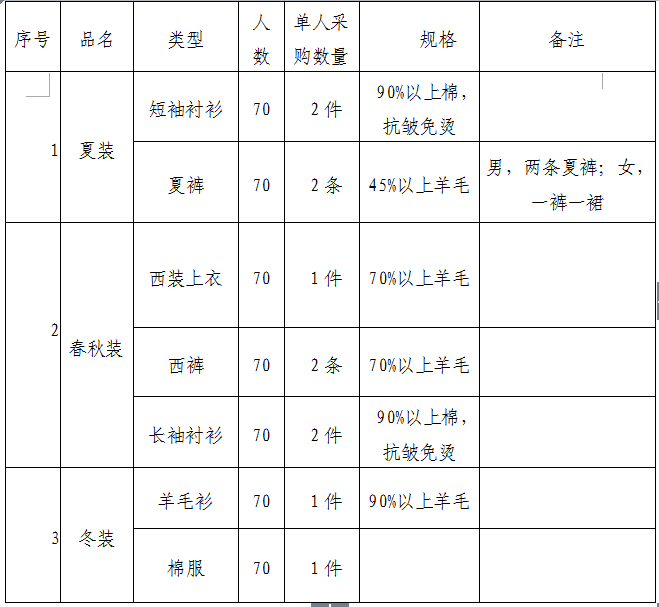 四、人員范圍:配置工作服的人員為集團公司在崗的全體員工,約70人。(以實際采購數(shù)量為準)