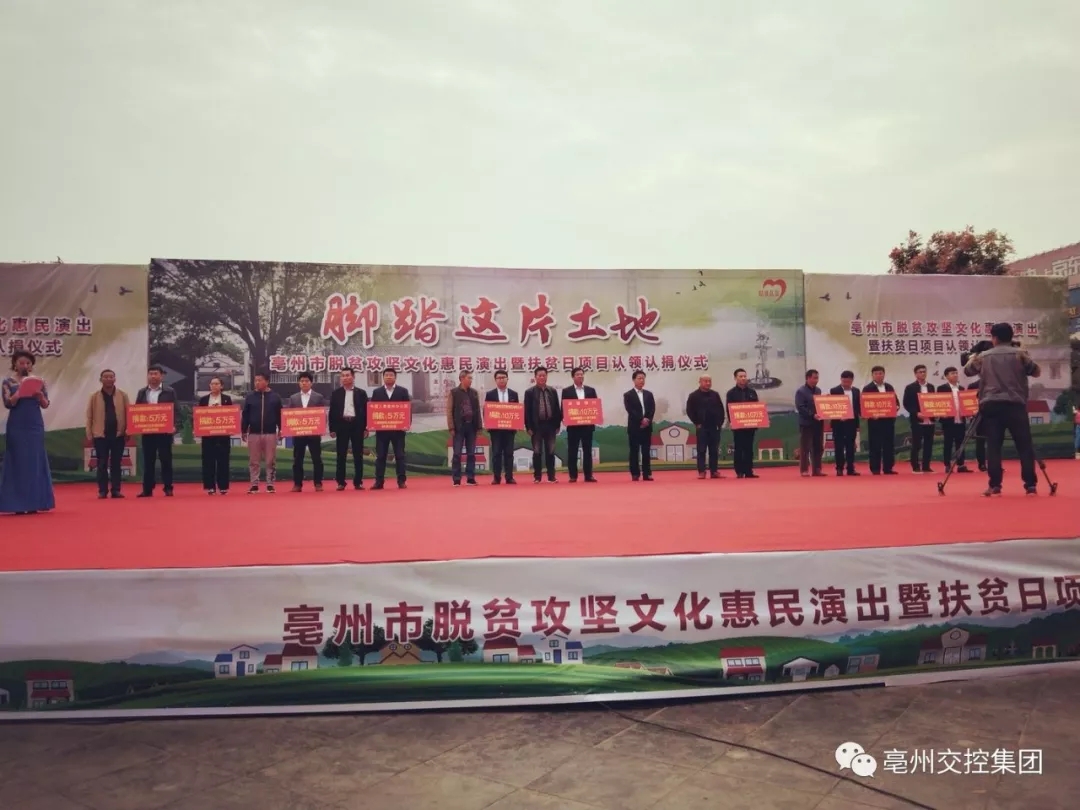 近日,由亳州市委組織部、市委宣傳部、市工商聯(lián)等聯(lián)合舉辦“腳踏這片土地”——亳州市脫貧攻堅文化惠民演出暨扶貧日項目認(rèn)領(lǐng)認(rèn)捐活動在魏武廣場天幕劇場舉行。交控集團現(xiàn)場舉牌認(rèn)領(lǐng)20萬元譙城區(qū)、利辛縣扶貧項目。