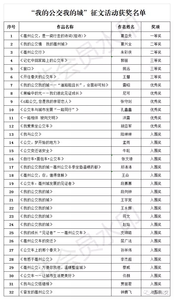 恭喜以上獲獎作品,請獲獎作品的作者前往譙城區(qū)1289號市交通運輸局旁交通綜合大樓4樓領取公交卡,聯系人:王部長 18956888074。